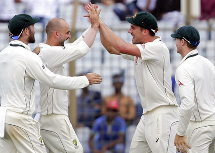 Lyon helped Australia bowl Bangladesh out just after the tea break. Left-arm spinner Steve O'Keefe (2/49) and fast bowler Pat Cummins (2/27) complemented the effort of Lyon, who now has 22 wickets in the two-Test series, second to Sri Lanka bowler Rangana Herath's 23.