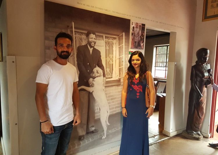 India batsman Ajinkya Rahane, who hasn't played a single Test in South Africa despite being the most averaging overseas batsman among the rest, on Tuesday visited anti-apartheid revolutionary Nelson Mandela's home at Orlando West, Soweto, along with his wife Radhika Dhopavkar.
