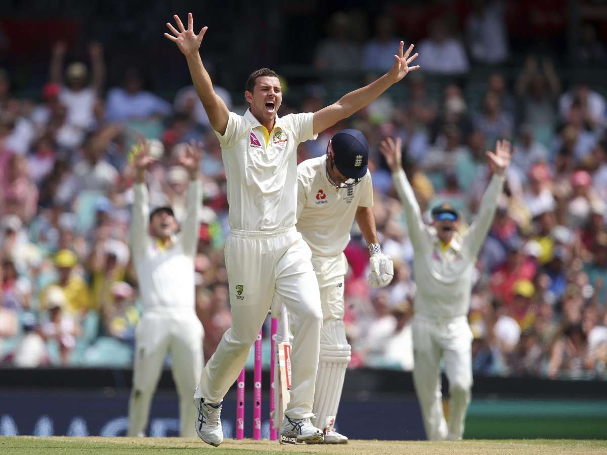 Hazlewood pinned the veteran opener on his front pad and had the initial not-out decision overturned by the TV umpire on review to leave England at 95-3 and the majority of the near 45,000 Sydney Cricket Ground crowd delighted.