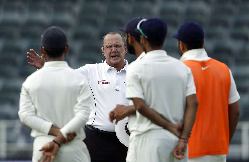 20.42 IST: The match referee, Andy Pycroft is being called into action. Grim faces in the South African dressing room. Faf du Plessis is waiting in anticipation. There is some arm waving from Dar. He is walking towards Virat Kohli who is looking angry. He has a right to be that way as India also batted on this surface. Meanwhile, Gould walks across to the batsmen and tells them to walk off.