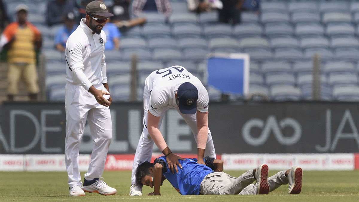 On Day 3 of the Pune Test, a pitch invader ran towards Indian opener Rohit Sharma in attempt to touch his feet. In the process, the invader also took Rohit down with him later security guards entered the ground to take him away.