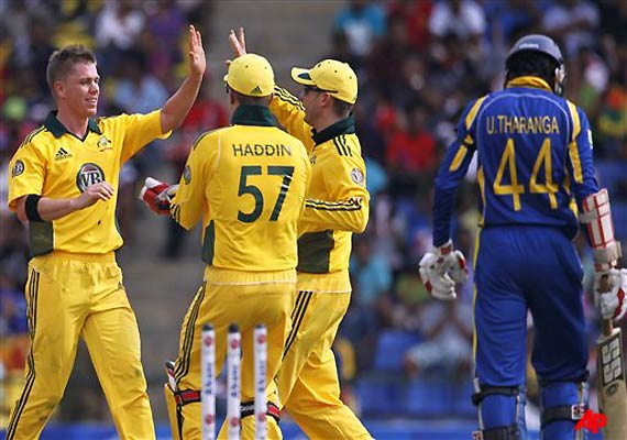 Australia lost two early wickets in their chase with opener Shane Watson (12) and Ricky Ponting (0) being bowled in the seventh over of the innings by seamer Lasith Malinga. Both wickets were lost with the total on 26.