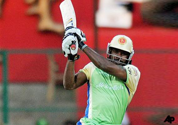 Bangalore, May 14: Chris Gayle plundered 38 runs in a 12-ball blitzkrieg as Royal Challengers Bangalore scored an emphatic four-wicket win over Kolkata Knight Riders under Duckworth-Lewis method in a rain-truncated match to seal a play-offs berth in Indian Premier League here today.