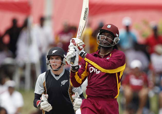 Gayle, in his first international in his home country for three years, was first to stamp his mark, launching Tim Southee for his first six and sending two more sixes sailing out of the ground off Nicol and Tarun Nethula.