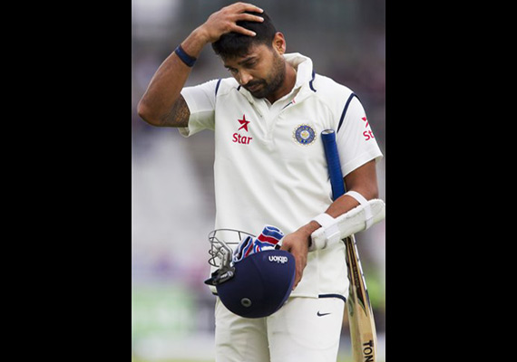 England medium-pacer Chris Woakes (1-13), who shared the new ball with James Anderson after Stuart Broad was retired hurt post getting a hit on the nose while batting, trapped Vijay LBW for 18 to give the hosts an early breakthrough.