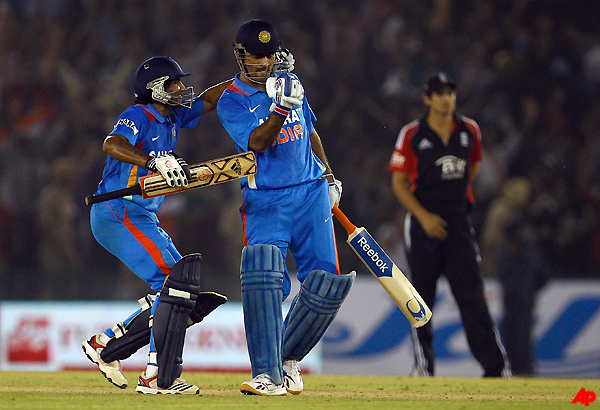 After England scored a competitive 298 for four, the home side rode on Ajinkya Rahane's 91 and a composed captain Mahendra Singh Dhoni's calculated onslaught to overhaul the target of 299 with four balls to spare.