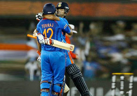 Yuvraj Singh slammed Brett Lee to the boundary to bring about the dramatic victory as the Indian players and officals hugged each to celebrate the triumph amidst deafening cheers from nearly 43,000 spectators.
