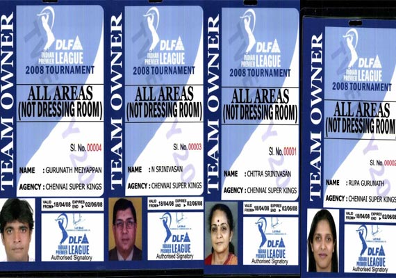 India TV has IPL all areas entry passes dated back to 2008, which clearly shows N. Srinivasan, his wife Chitra Srinivasan, daughter Pushpa Srinivasan and son-in-law Gurunath Meiyappan all holding OWNER passes for access to all areas, except dressing room.