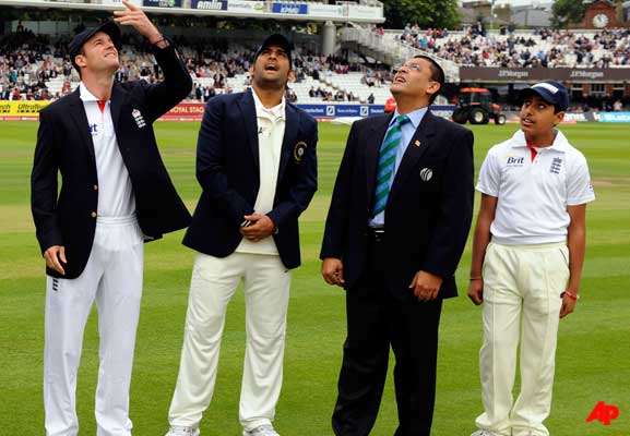 London, Jul 21 : Indian captain Mahendra Singh Dhoni won the toss and elected to field in their first of the four-match Test series against England at Lord's here today. Overcast conditions following light rain appear to have dictated India's choice who are fielding three medium pacers, including returning pace spearhead Zaheer Khan.
