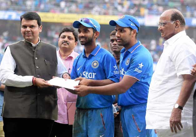 Mumbai batsmen Rohit Sharma and Ajinkya Rahane handed over the cheque to Fadnavis on behalf of the MCA at the Wankhede Stadium here in the presence of MCA president Sharad Pawar during the innings break after South Africa posted a massive 438/4 in 50 overs against India in the fifth and final One-Day International (ODI).