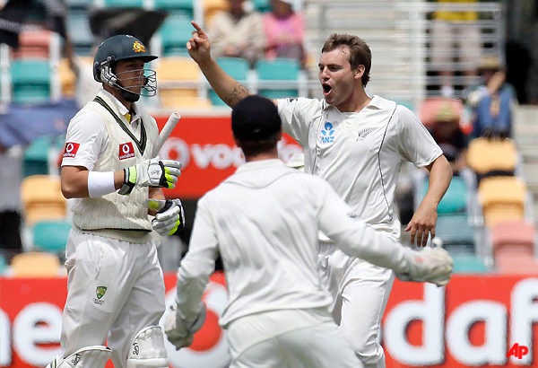The Australians had resumed on the fourth day at 72 without loss and didn't add a run before Phillip Hughes (20) was dismissed by Chris Martin for the fourth time this series—edging to Martin Guptill at second slip for the second time in the match.