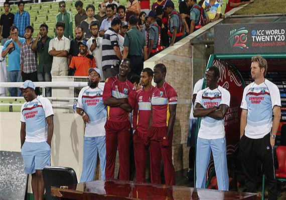 The West Indies were 80 for four in the 14th over, needing to reach 161 for victory but were well behind their DL par score of 108 when the match ended.