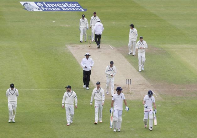 Alastair Cook and Adam Lyth, who put on 177 for the first wicket in the first innings, were on 18 and 24, respectively, after a chanceless start. They were scoring quickly before the weather intervened, although New Zealand is