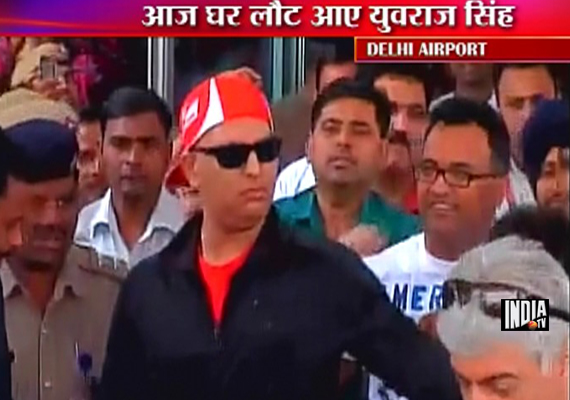 His head, which went bald during the treatment, was covered by a red sports cap. Wearing a red T-shirt teamed with Khaki pants, Yuvraj made his way through hordes of fans and waiting media personnel after coming out from back gate of the airport.