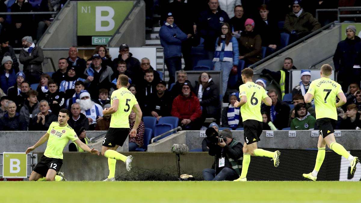 In a game where United had two goals ruled out by the video assistant referee, the strike that was allowed came in the 23rd minute when a long clearance by goalkeeper Dean Henderson wasn’t dealt with effectively by defender Lewis Dunk and Oli McBurnie raced clear to finish.