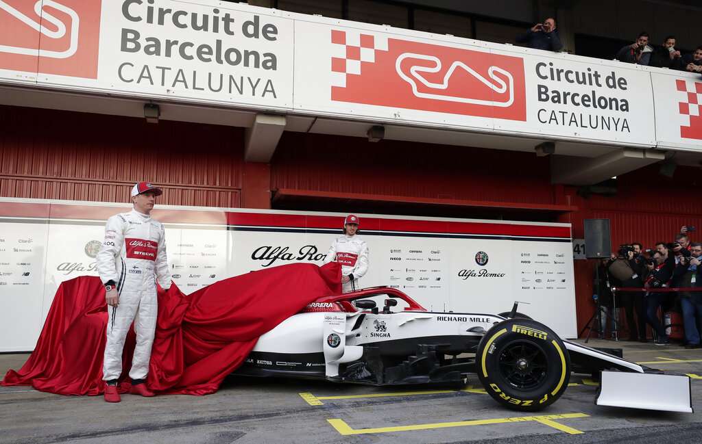 Raikkonen, teammate Antonio Giovinazzi and team principle Frederic Vasseur posed with the white-and-burgundy Alfa Romeo C38 in the pit lane of the Barcelona-Catalunya Circuit before preseason testing started on Monday.