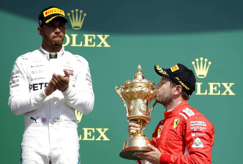 Hamilton managed to fight his way back to finish second after a Ferrari-Mercedes duel developed with Valtteri Bottas leading until Vettel hit the front again with five laps to go.
