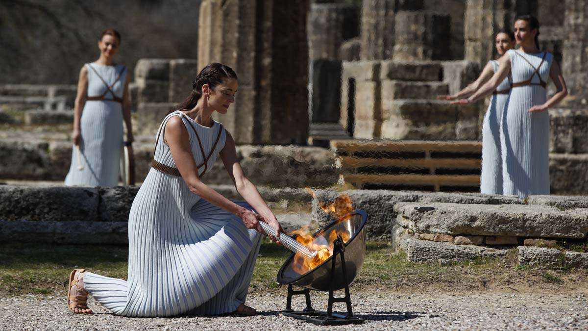 Standing in front of the ruined Temple of Hera in Ancient Olympia, a Greek actress playing the part of a pagan priestess used a concave mirror to focus the sun's rays on a silver torch, causing fire to spurt forth.