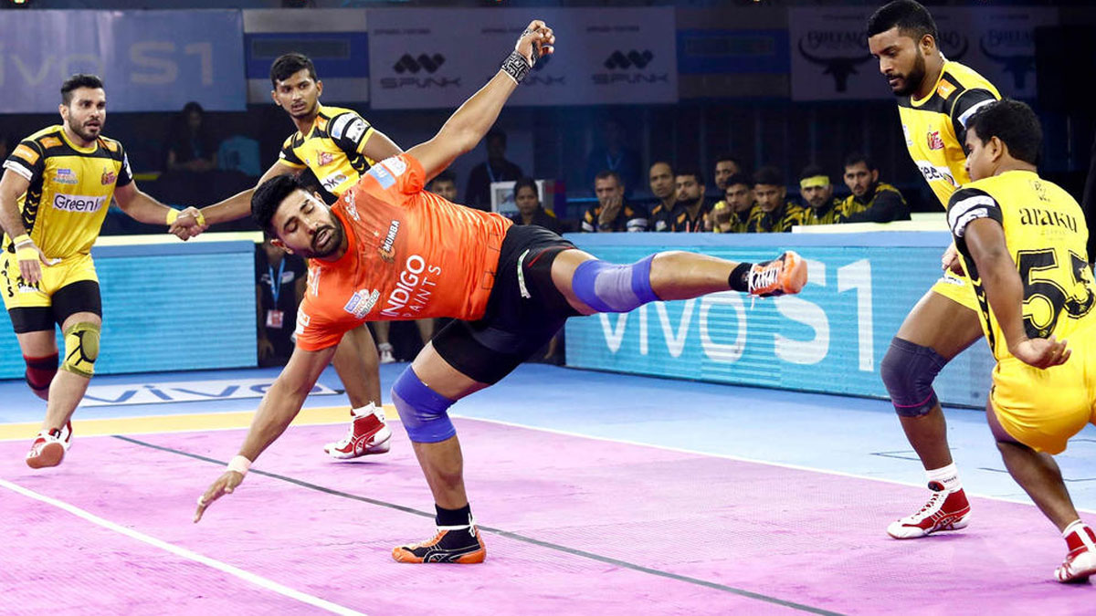 But Farhad Milaghardan saved the Telugu team the blushes by picking up two points in the final raid of the half to prevent an All-Out. The half ended with the scores level at 15-15.
