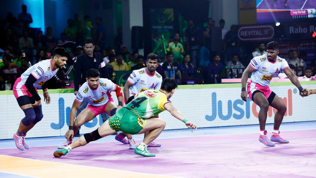 Pardeep opened Patna Pirates' account with a raid point in the first minute. Sandeep clocked his 150th tackle point as Jaipur Pink Pirates led 2-1. Amit tackled Jang Kun Lee in the fourth minute as both teams were tied at 3-3.