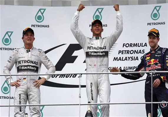 Hamilton beat teammate Nico Rosberg by 17.3 seconds at the Sepang International Circuit, with defending world champion Sebastian Vettel of Red Bull third.