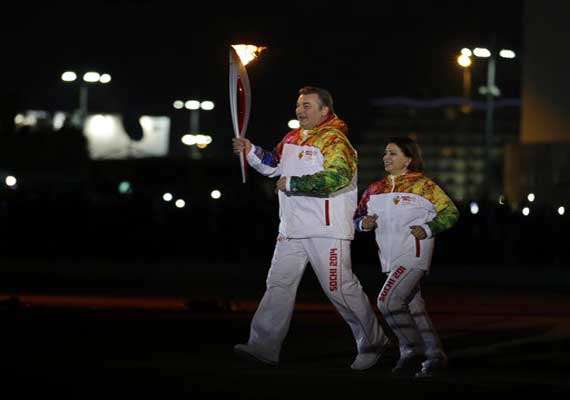 They were handed the torch by Alina Kabayeva, a former Olympic champion gymnast who has been linked romantically with Russian President Vladimir Putin, although the Kremlin has denied it. Other torchbearers in the final group were wrestling great Alexander Karelin, pole vaulter Yelena Isinbayeva and tennis star Maria Sharapova.
