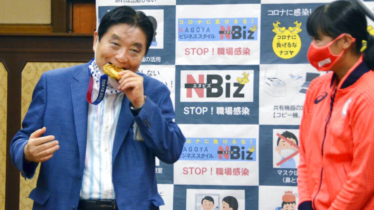 Nagoya mayor Takashi Kawamura had praised pitcher Miu Goto during the Aug. 4 visit, but his eyes were glued to her medal. He asked her to put it around his neck. Kawamura then pulled down his face mask and bit into it.