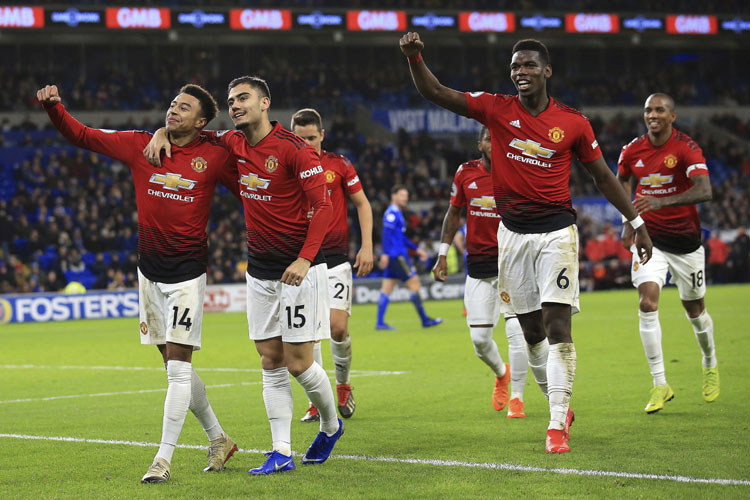Jesse Lingard scored twice as Manchester United celebrated its first match under new coach Ole Gunnar Solskjaer with a 5-1 rout of lowly Cardiff in the Premier League on Saturday.