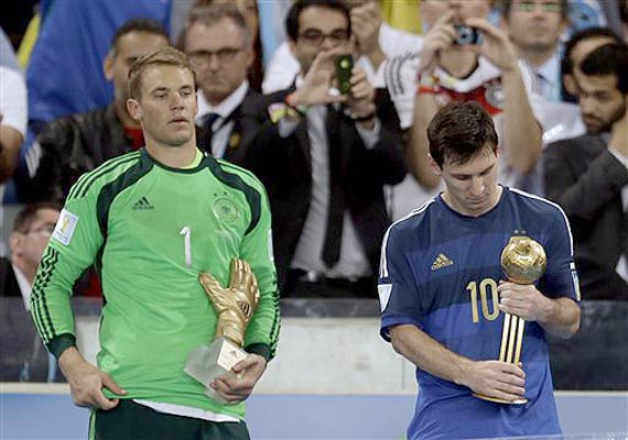 Messi was selected ahead of Thomas Mueller of Germany and Netherlands forward Arjen Robben by FIFA's technical study group of coaching analysts. Germany's Manuel Neuer collected the best goalkeeper prize.