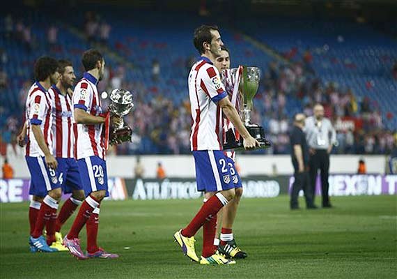 Atletico received the trophy as champions of last season before the match to the delight of the packed Vicente Calderon Stadium. And it looked ready to keep the celebration going after taking a 2-0 lead in a one-sided half hour following headed goals by Miranda and Mario Mandzukic in the 11th and 25th minutes.