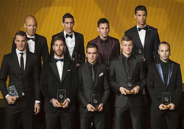 Manuel Neuer (Bayern Munich/Germany), Philipp Lahm (Bayern Munich/Germany), Thiago Silva (Paris Saint-Germain/Brazil), David Luiz (Chelsea/Paris Saint-Germain/Brazil), Sergio Ramos (Real Madrid/Spain), Angel Di Maria (Real Madrid/Manchester United/Argentina), Toni Kroos (Bayern Munich/Real Madrid/Germany), Andres Iniesta (Barcelona/Spain), Cristiano Ronaldo (Real Madrid/Portugal), Lionel Messi (Barcelona/Argentina), Arjen Robben (Bayern Munich/Netherlands).