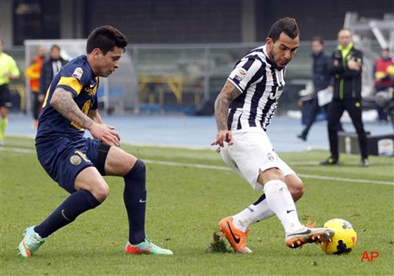 Verona reduced the deficit seven minutes after halftime when former Juventus striker Toni headed in Romulo's free-kick. There were suspicions of offside, as there had been for Tevez's second.