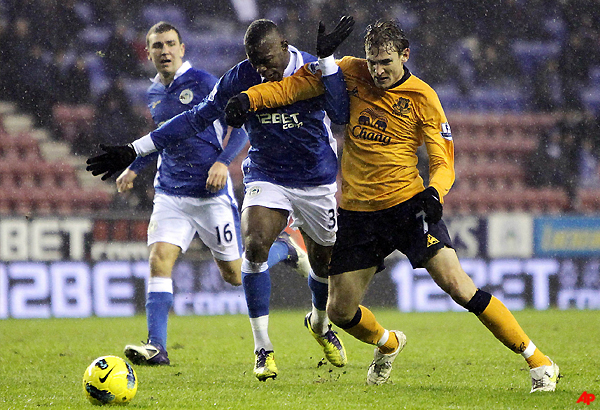 Neville, who came on for the injured Tim Cahill at halftime, appeared to have thwarted a Wigan attack when he blocked a cross by Jean Beausejour. But the ball deflected toward Howard who let it bounce only to see it end up in the Everton goal.