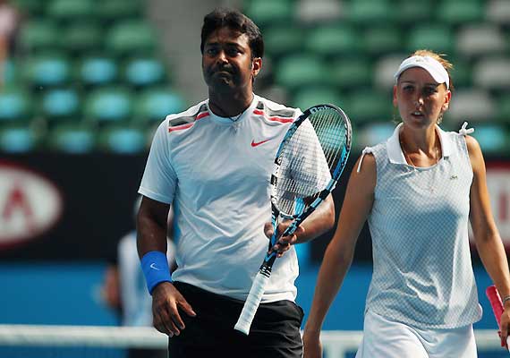 Paris, June 6: India's Leander Paes and Elena Vesnina of Russia fought their way to the mixed doubles semifinals of the French Open with a thrilling 4-6, 7-5, 10-5 victory over Max Mirnyi of Belarus and American Liezel Huber on Tuesday.