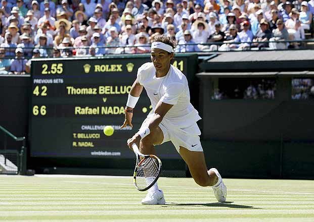 Two-time Wimbledon champion Nadal got off to a roaring start, defeating Thomaz Bellucci 6-4, 6-2, 6-4.The No. 10 seed hit 21 winners and saved four of the six break points he faced in the two hour, 10-minute match.