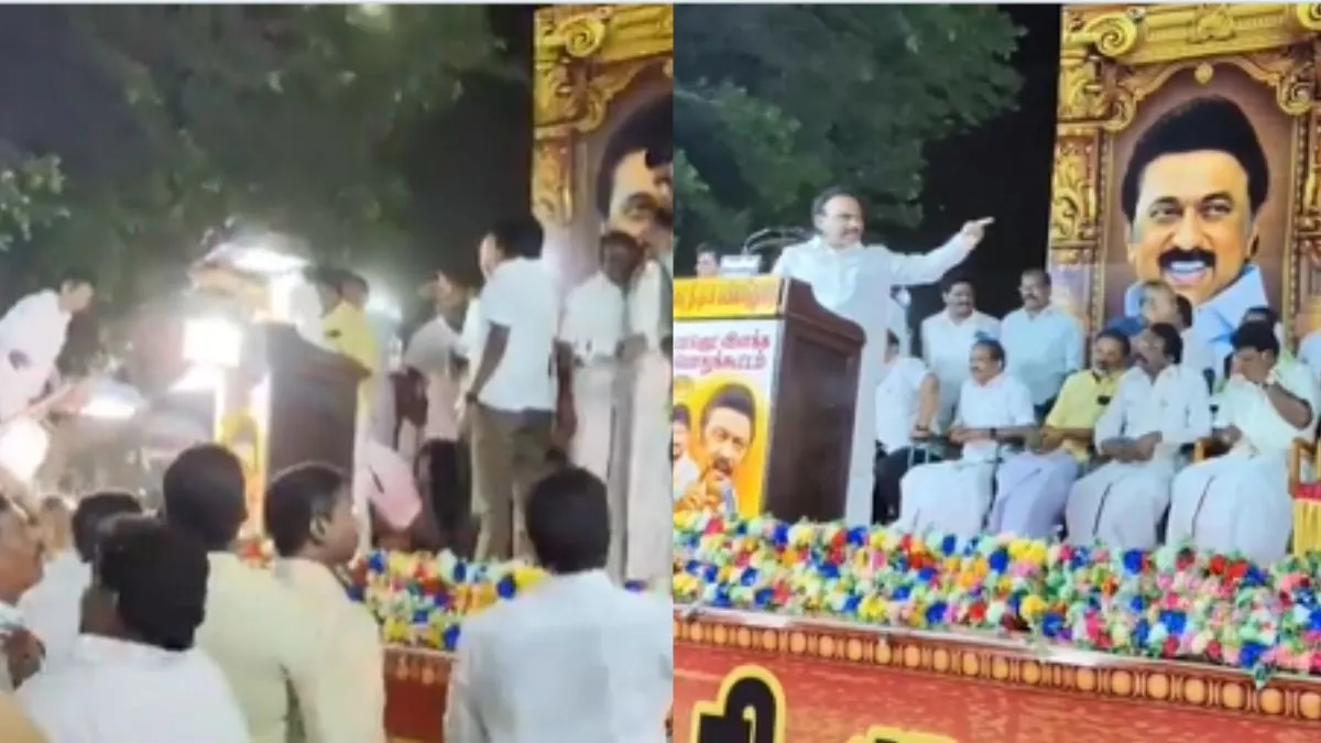 DMK MP A Raja had a close shave during a public meeting in Tamil Nadu's Mayiladuthurai on Sunday after gusty winds caused the overhead focus lights in the event to collapse near the stage. A video of the MP's narrow escape has now gone viral on social media.