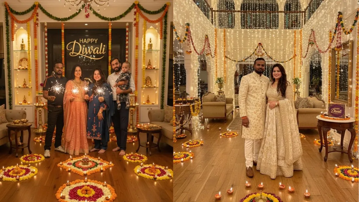 (Image Source : GEMINI)Merge both photos- all people standing together and wearing peach and golden Indian attire, having phooljhadi in their hands. All are standing in a fancy home living room, with diyas, clay lamps, and natural decorations of flowers around- with DIWALI wishes.