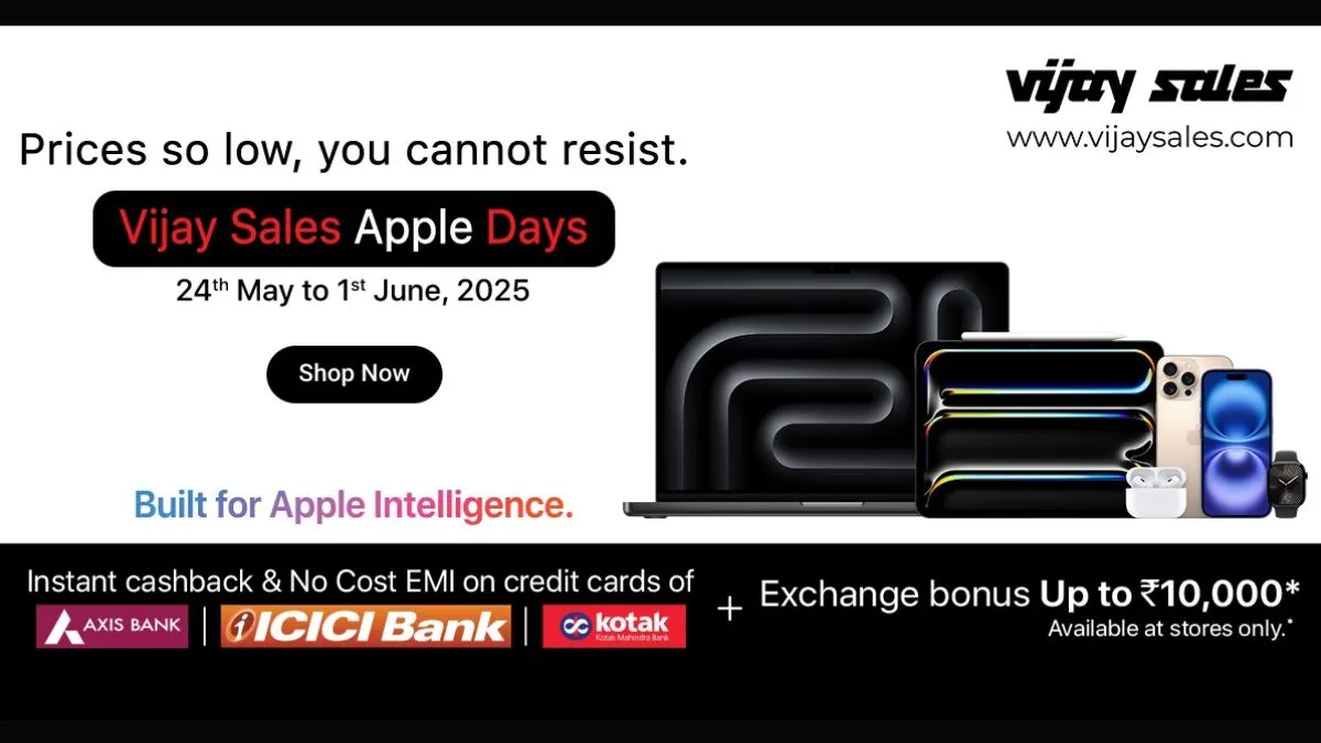 Vijay Sales Apple Days Sale is set to kickstart from tomorrow, May 24 and will last till June 1, 2025. The sale will feature major discounts on the latest iPhones, iPads, MacBooks, Apple Watches and AirPods. Customers can also avail exchange bonuses of up to Rs 10,000 and instant discounts using ICICI, Axis, and Kotak Mahindra bank cards.