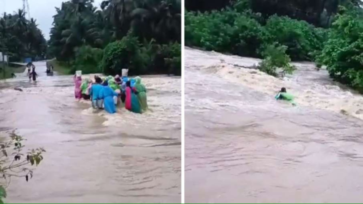 A woman is still missing after she was struck by flash floods while crossing a floodgate in Bhadradri Kothagudem during heavy rains in Telangana state. Video taken from the scene shows a group of women trying to cross the furious waters, but the woman in green is dragged by the strong current. A warning came and several men rushed to protect her.