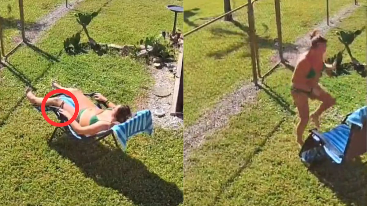 The footage shows the woman enjoying the summer weather by sunbathing in a bikini and peacefully lying on a towel spread on a pool chair in her garden. The woman had a fright when the snake unexpectedly crawled up her leg during the sunbathing session. The clip shows the thin snake slithering onto the woman's leg and causing her to jump up and run across her yard.