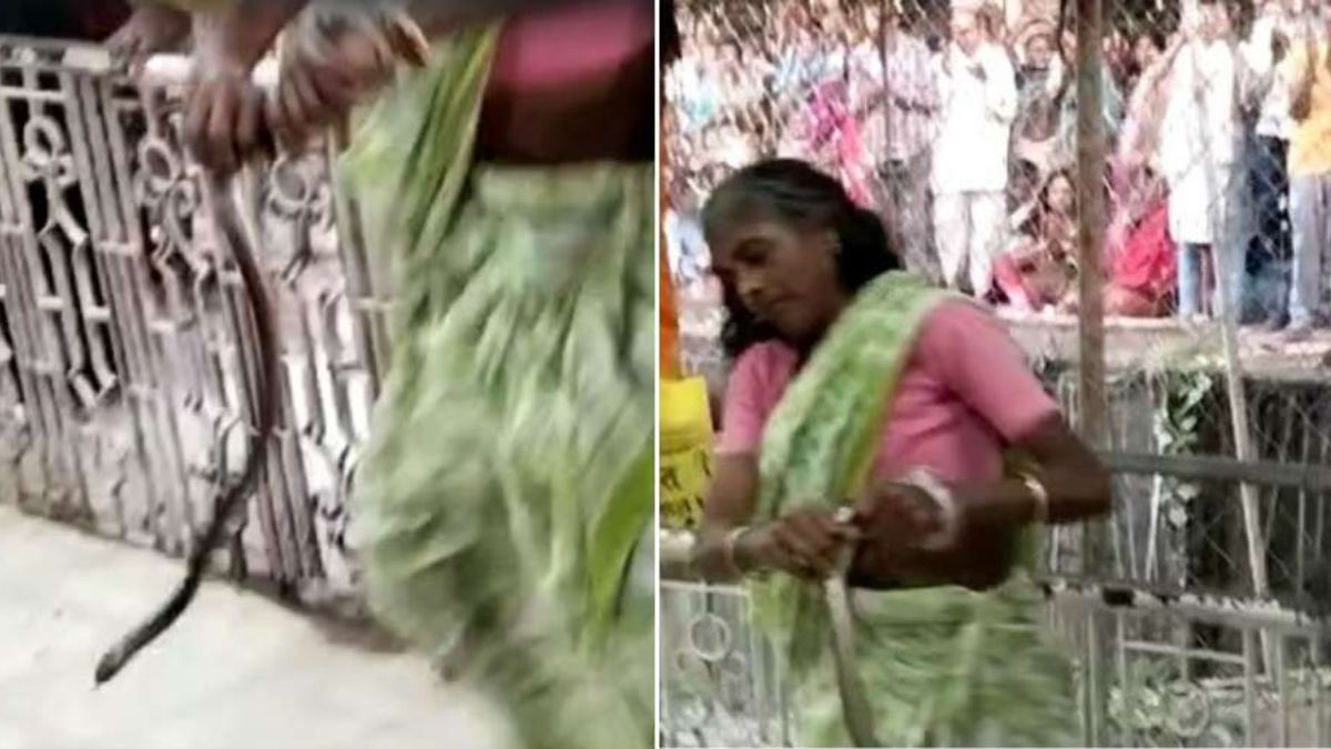 Watch the viral video of snake wrapping around hand of woman dancing in maha aarti at Hanuman temple here: