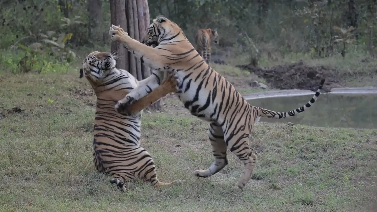 Two energetic and cute cubs of the famous F2 tigress are captivating wildlife enthusiasts at Nagpur's Umred Karhandla Parni Sanctuary, drawing tourists from across the globe for a glimpse of their antics. Captured on video by ace wildlife photographer Sandeep Gujar, the 14-month-old duo- often spotted with their mother and siblings, including N4 tiger's kin- showcase perfect coordination and boundless energy. Their playful escapades around artificial water holes have left visitors spellbound, proving these young tigers haven't lost their mischievous streak despite growing bigger.