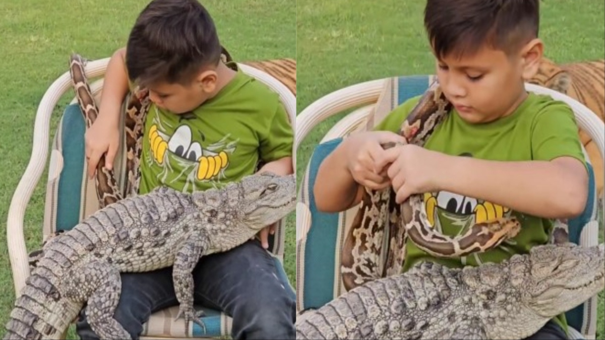 A video of a child fearlessly sitting with a massive snake surrounding him and a baby crocodile on his lap has gone viral. The video which was posted on Instagram on October 15 shocked the users. What added to the shock further was a tiger which was sitting in the background observing the little child interacting with the other two animals.