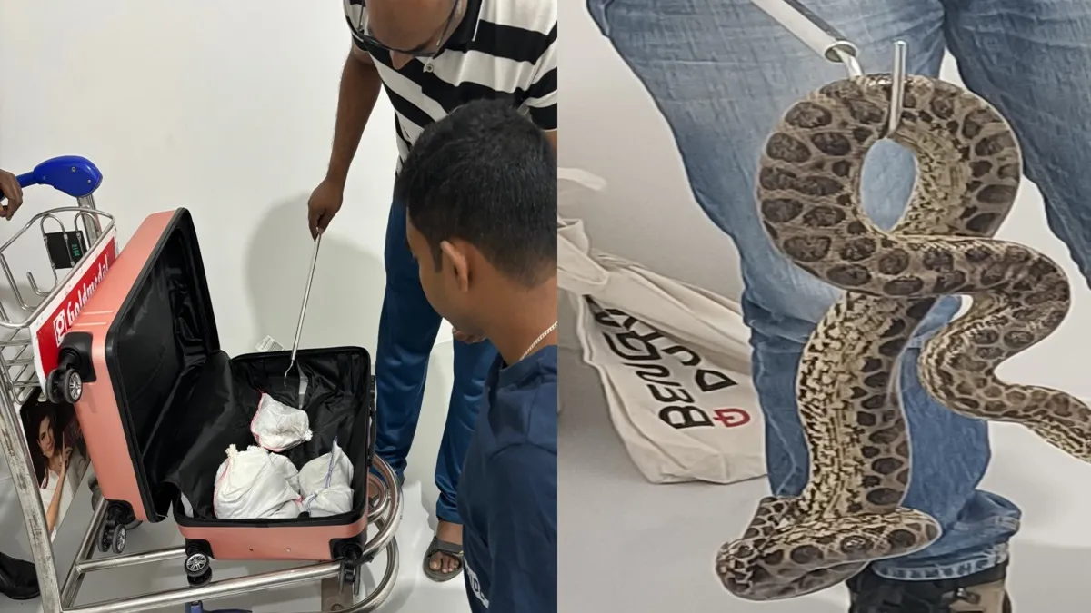 In a shocking turn of events, a passenger was arrested for allegedly attempting to smuggle yellow anacondas concealed in his check-in baggage at Kempegowda International Airport in Bengaluru on Monday.